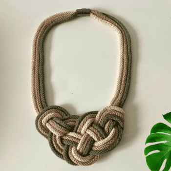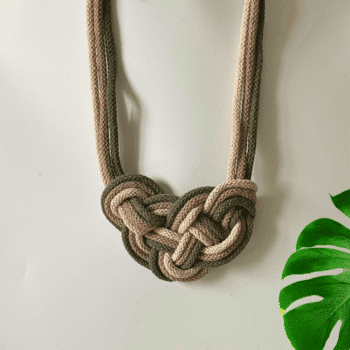The Macrame Knot Necklace is made from 100% cotton cords in three colours: khaki, vanilla, and brown sugar. The necklace is eco-friendly, ensuring sustainable fashion.
