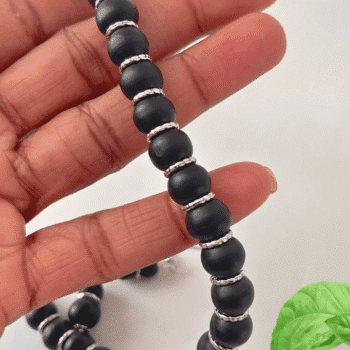 - Materials: 8mm and 10mm black wooden beads, twisted open split jump rings, stainless steel findings