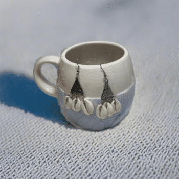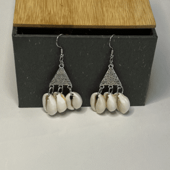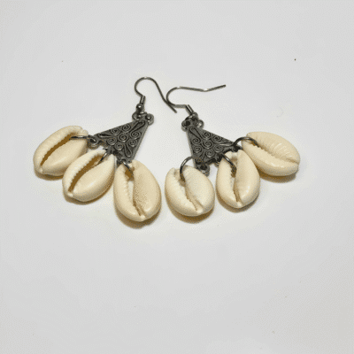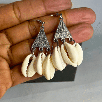 Three cowrie shells dangle gracefully from the triangle’s base, creating a mesmerizing effect and connecting to nature’s beauty. The stunning cowrie shells were meticulously handpicked to complement the silver filigree. These natural elements infuse the earrings with coastal allure and timeless beauty. Each shell carries its unique markings and textures, ensuring that every pair of earrings is one-of-a-kind.